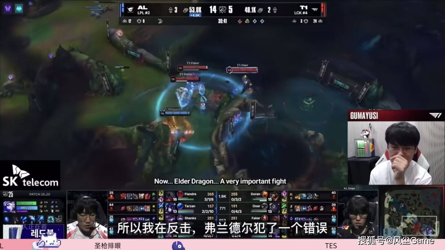 圣枪哥在不确定T1站位的情况下,在草里用E去刷普攻排真眼,确实有点冒失,但绕后的决策,其实是没啥问题的,T1有电龙魂、寒冰、女明星,各种减速,拉扯能力是很强的,正面开的话,AL胜算其实更低,团还没打起来,剑魔估计就没血了,也只能说视野太差,被逮T1给到机会了。