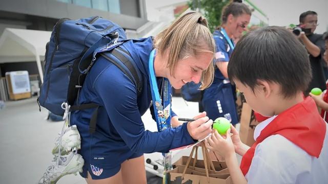 在今年的“开学第一课”中,同学们还走进了成都世运会棍网球决赛现场,热情洋溢地为选手助威。赛后,大家与冠军球队面对面互动——送上亲手绘制的明信片,收获球员亲笔签名的纪念球,在激动与敬佩中,零距离体会到竞技体育的拼搏精神和荣耀时刻。